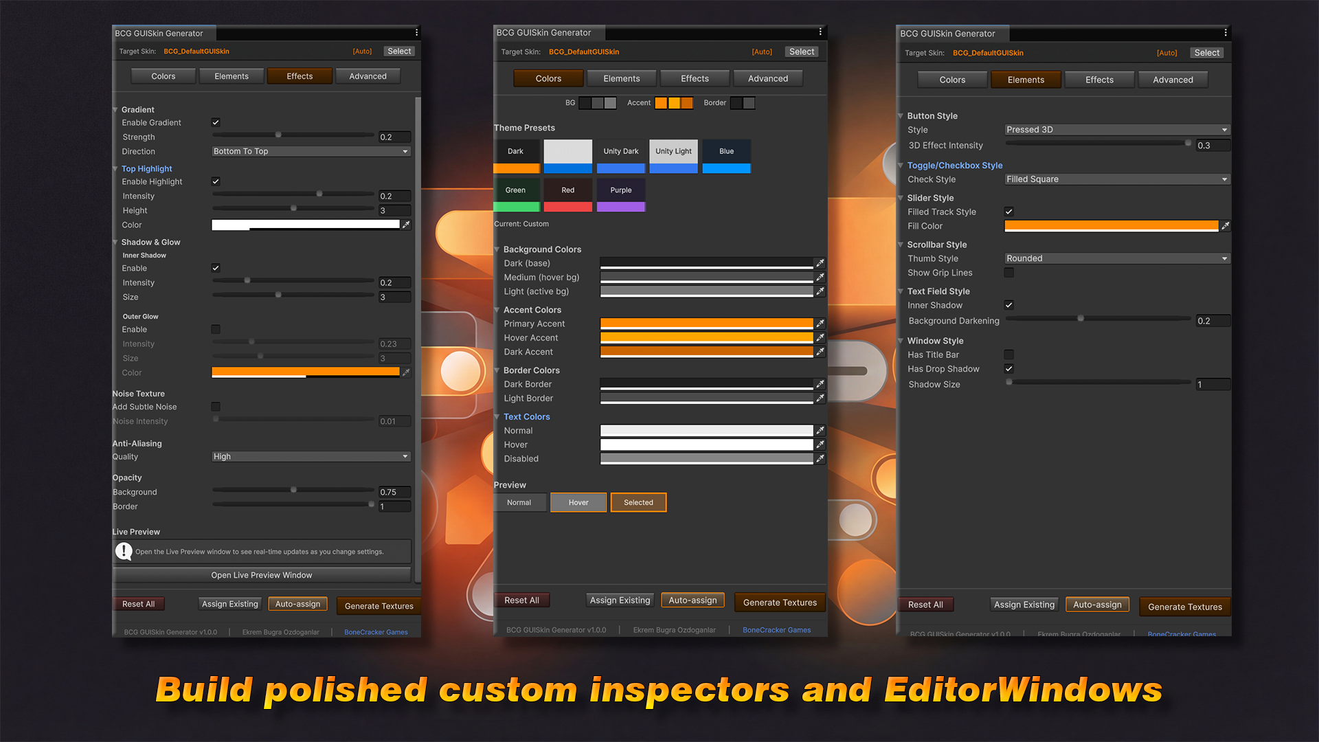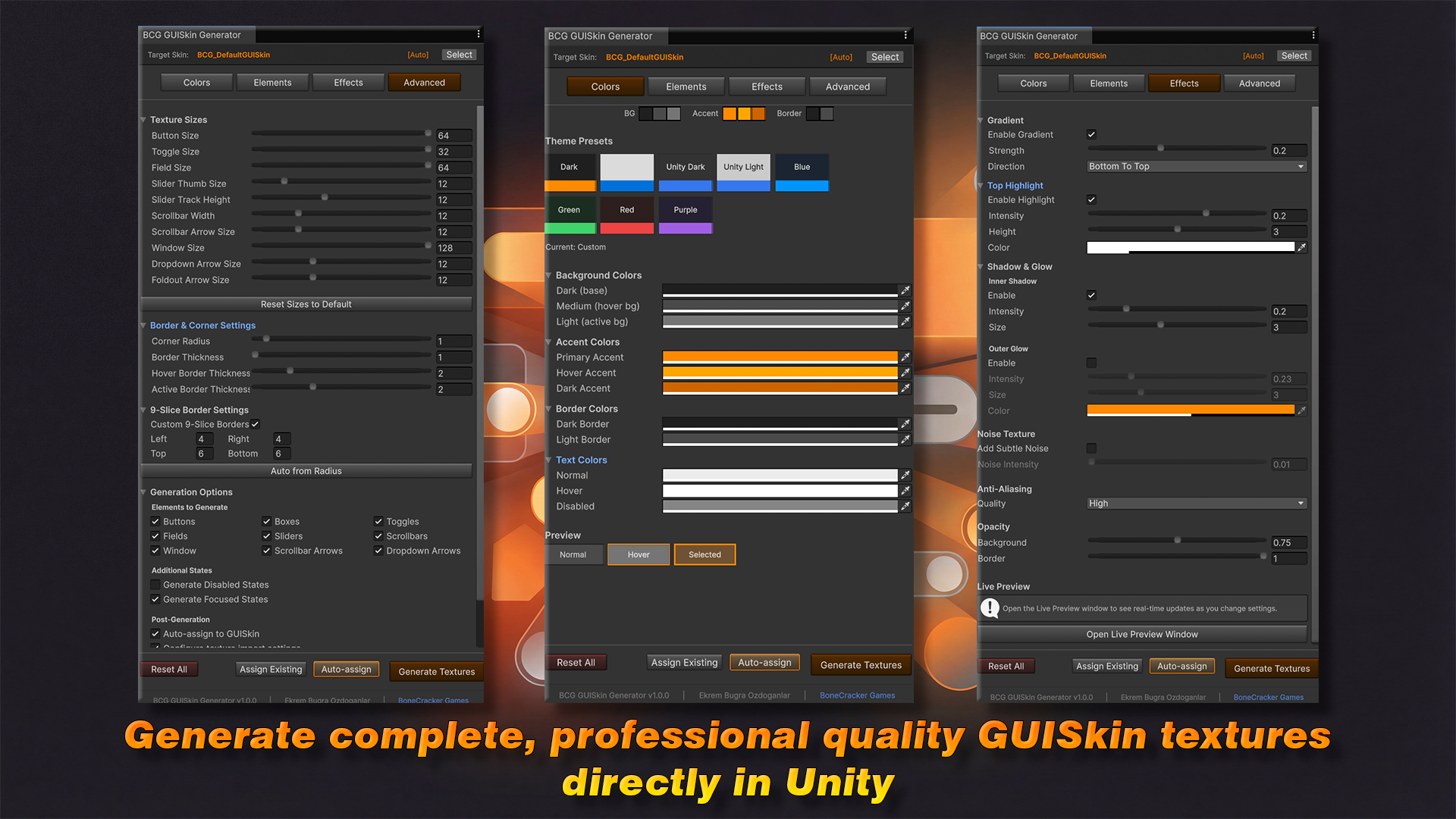 Open — Tools → BoneCracker Games → GUISkin Texture Generator